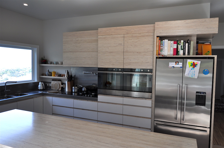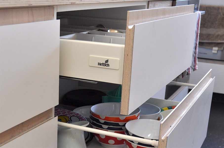 The central island bench top is from whitewashed laminated plywood, with under-counter drawers featuring recessed pull handles and self-soft closing runners. The horizontally laminated cabinet fronts appear to wrap seamlessly around the walls.
