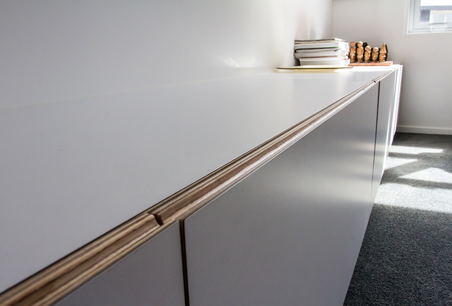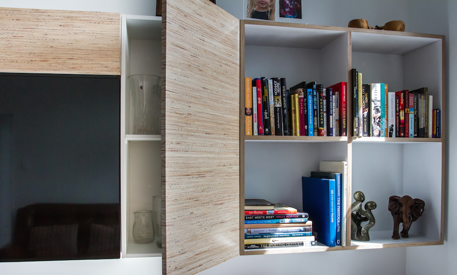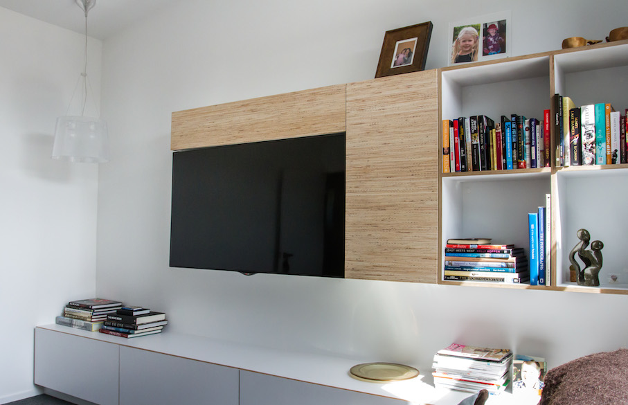 This modern media room seamlessly houses the flatscreen television whilst hiding any cables and digital boxes out of sight. The stripey plywood surrounding the TV can also be found in the kitchen, another Mano design and build.